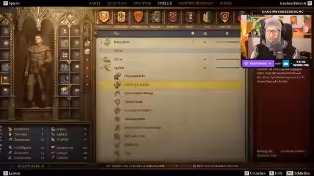 04:21:21Der Streamer entdeckt 14 verfügbare Spezialisierungspunkte und beginnt, diese durchzugehen. Er wählt Fertigkeiten wie 'Charmanter Mann', der die Steigerung des Rufs beschleunigt, und Opportunist, der den Rieverlust verlangsamt. Weitere ausgewählte Fähigkeiten betreffen die Tragekapazität, Stärke, Agilität und Vitalität, mit Schwerpunkt auf Schadenserhöhung.
