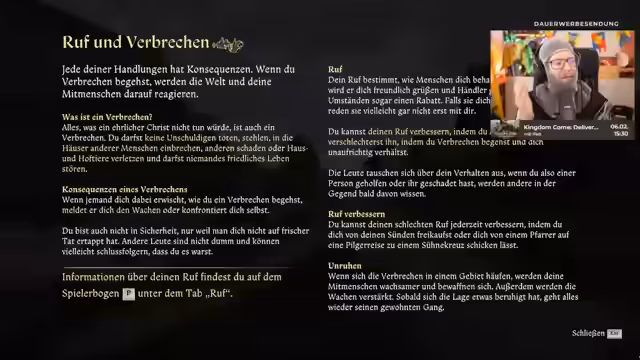 05:24:13Das Spiel erklärt das Rufsystem: Jede Handlung hat Konsequenzen, ob gut oder schlecht. Verbrechen wie Töten, Stehlen oder Stören friedlichen Lebens führen zu Rufverlust und können von anderen gemeldet werden. Der Ruf beeinflusst, wie Menschen den Charakter behandeln und ob sie mit ihm interagieren. Eine schlechten Ruf kann durch Buße oder Pilgerreisen verbessert werden.