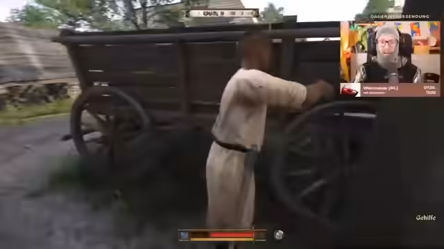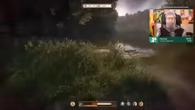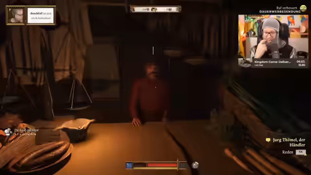 05:34:58Der Stream beginnt mit einer unklaren Situation, in der der Spieler zuerst orientierungslos im Dorf herumläuft. Er erkundet verschiedene Werkstätten wie einen Schleifstein zur Waffenschärfung und einen Alchemietisch. Nach erfolgreichem Schärfen des Jagdschwerts beginnt er mit dem Handel, zunächst jedoch erfolglos, da er kein Geld besitzt. Der Spieler untersucht verschiedene Gebäude und Händler im Dorf, darunter einen Schreiber und einen Händler namens Jurg Tümmel, mit dem er erste Handelsgeschäfte tätigt und seine ersten Groschen verdient.