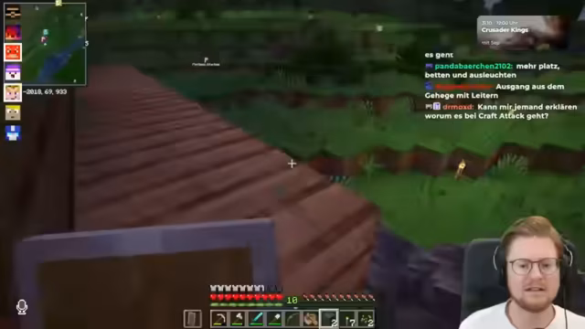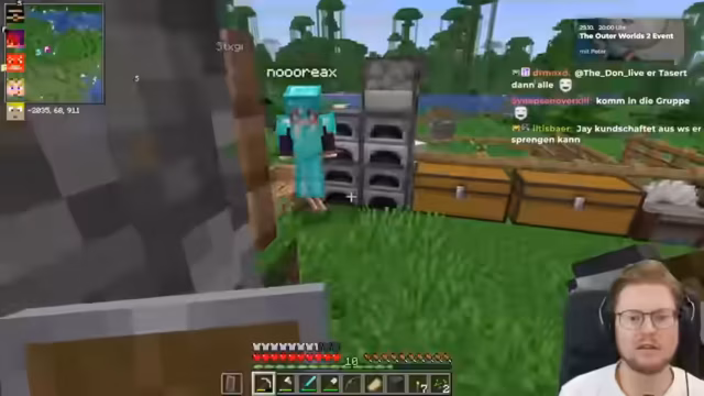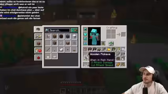 04:40:16Nach einer kurzen Unterbrechung, in der Bram den Stream verlässt, gibt es technische Probleme mit der Lautstärke von Bram, die von den Zuschauern als zu leise empfunden wird. Der Streamer versucht, die Audioeinstellungen anzupassen und erklärt, dass er sein Desktop-Audio für einen anderen Stream leiser stellen musste. Währenddessen wird die Idee einer Eisenfarm mit Zombies und Villagern angesprochen. Der Streamer konzentriert sich jedoch auf die Villager-Farm für Brot und versucht, die Funktionsweise des Droppers und des Trichters zu verstehen. Es wird diskutiert, wie die Kiste platziert werden sollte, damit der Villager nicht abhaut. Die Community gibt Ratschläge zur Positionierung der Kiste und des Trichters, um eine effiziente Item-Absaugung zu gewährleisten. Der Streamer baut provisorisch eine Kiste vor dem Zaun und befüllt sie mit gesammelten Gegenständen, während er die Anweisungen des Chats befolgt, um die Farm zu optimieren.