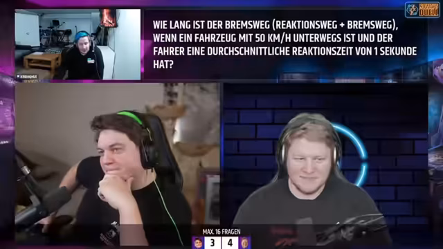 03:04:56Der Stream beginnt mit einem Fahrschul-Quiz, bei dem Brammen und Freddy Fragen zu Verkehrsvorschriften beantworten. Die erste Frage betrifft die gesetzliche Mindestprofiltiefe von Autoreifen, die 1,6 Millimeter beträgt. Brammen beantwortet diese Frage korrekt und erhält einen Punkt. Die Teilnehmer diskutieren anschließend die Bedeutung dieser Profiltiefe für die Sicherheit im Straßenverkehr, insbesondere bei Aquaplaning.
