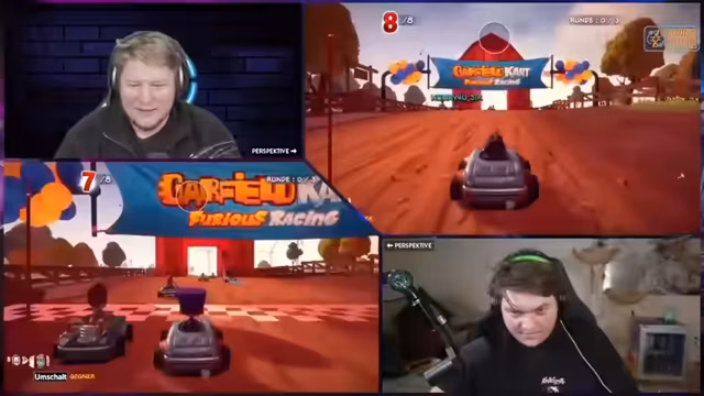 04:06:47Zum Abschluss spielen die beiden das Rennspiel 'Garfield Kart', ein Mario-Kart-Klon. Es wird ein Grand Prix mit mehreren Rennen ausgetragen. Die Teilnehmer nutzen Controller zur Steuerung und erleben technische Unannehmlichkeiten beim Einrichten des Spiels. Die Rennen werden intensiv kommentiert, während die Punkte für den Gesamtsieg manuell mitgezählt werden müssen.