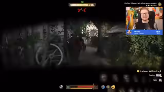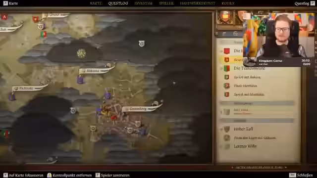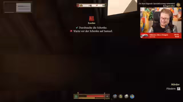 01:32:14Nach dem kurzen Unterbrechung zur Anpassung der technischen Einstellungen und des Streamlayouts wird das Spiel Kingdom Come: Deliverance 2 gestartet. Der Streamer erklärt kurz den aktuellen Stand der Story: Er spielt eine Nebenfigur, den Pfarrer, während die Hauptfigur Heinrich zuvor eine geheime Versammlung von Gegnern des Königs Wenzel belauscht hat. Der Fokus liegt nun auf einer Versammlung der Unterstützer von Wenzel. Die Hauptaufgabe ist, die jüdische Gemeinde in Kuttenberg zu kontaktieren und deren Unterstützung zu gewinnen. Die erste Interaktion findet mit Rabbi Yehuda und dessen Begleiter Samuel statt.
