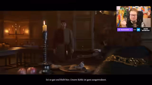 02:34:15Der Stream beginnt mitten im Kampf um die Festung. Protagonist Heinrich ist besoffen und tobt sich auf dem Schlachtfeld aus. Er beklagt den Verlust seines Bruders Christopher, der schwer verletzt wurde, und kämpft mit roher Gewalt gegen die feindlichen Truppen. Die Kampfhandlungen sind chaotisch, und Heinrich verspricht blutige Rache am König Siegesmund, der die Belagerung angeführt hat. Nach dem Kampf wird das Plündern der gefallenen Feindlichen begonnen.
