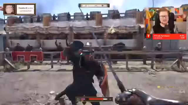04:39:31Der Streamer kämpft in starker Rüstung und erlebt intensive Schlagabtausche. Er bemerkt, dass der Gegner erheblichen Schaden anrichtet und muss seine Ausdauer regenerieren. Nach einem Kampf mit einem名字 ebenfalls Peter, wird das Turnier mit dem finalen Duell zwischen den besten Kämpfern fortgesetzt. Der Gegner, ein Zähnschläger, wird als die ganze Stadt bekannt beschrieben. Der Streamer muss sich konzentrieren und seine Ausdauer im Auge behalten, um nicht zu gierig zu werden und seinen Vorteil wahren zu können.