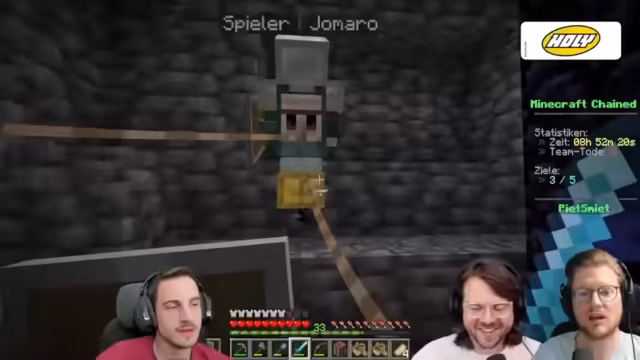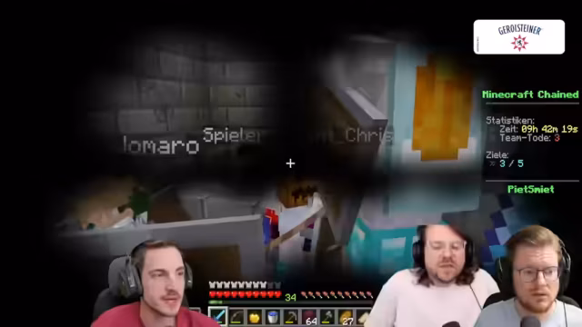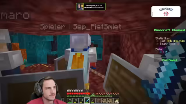 00:33:42Das Team konzentriert sich darauf, Gold in Minecraft zu handeln, um nützliche Ressourcen zu erhalten. Sie entdecken auch Bastionen in der Netherwelt, die ihnen Zugang zu wertvollen Gegenständen wie Spitzhacken und anderen Werkzeugen verschaffen. Dabei erleben sie gefährliche Begegnungen mit Gegnern, wie z.B. Axtmännern, die tödlich sein können. Die Streamer müssen wachsam sein und strategische Entscheidungen treffen, um die Ressourcen sicher zu erhalten.