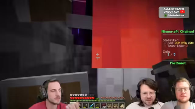 01:06:55Die Gruppe befindet sich im Endspurt der Minecraft Chained Challenge, bei der sie als Vierer-Team aneinandergekettet sind und fünf Aufgaben lösen müssen. Bereits drei von fünf Aufgaben wurden erfolgreich abgeschlossen. Die verbleibenden Aufgaben sind das Besiegen des Enderdrachen und das Finden der Rose des Wizzers. Die Aufregung steigt, da die Teammitglieder zeitlich gegen andere Teams antreten und bereits drei Stunden auf der Suche nach Enderperlen und Enderaugen verbracht haben.