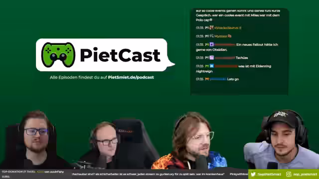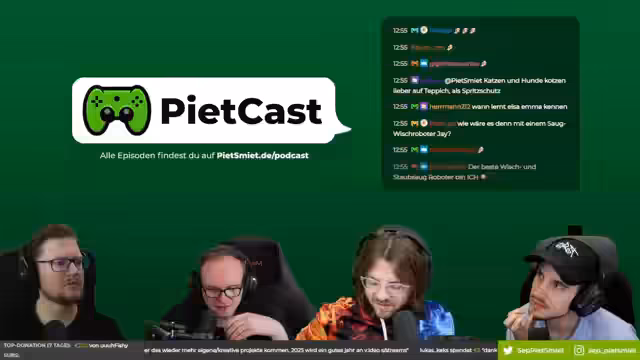 00:43:08Nach dem Spiel-Teil wechselt der Stream zum Pietcast. Das Team kündigt den Podcast 'Feedcast 64' an und spricht über die Verfügbarkeit auf verschiedenen Plattformen. Es gibt eine kurze Pause, in der sie sich organisieren. Die Stimmung ist nun ruhiger und konzentrierter, da sie in den Podcast-Modus wechseln und das Publikum auf den Hauptinhalt des Abends vorbereiten.