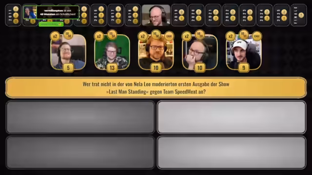 02:52:41Es folgt eine Frage zur ersten Ausgabe der Show 'Last Man Standing', bei der gefragt wird, wer nicht in der von Nela Lee moderierten ersten Folge gegen das Team 'Speedmeet' angetreten ist. Die Antwortmöglichkeiten sind Namen wie David Hain und Sgt. Rumpel. Es kommt zu einer Diskussion darüber, wer bei der Eröffnungshow wirklich dabei war und warum eventuell jemand fehlte. Der Streamer erinnert sich an die Teilnahme von Gronkh, Zara Zarr und Fabian Sigismund und vermutet, dass David Hain in einer späteren Folge debütierte. Der Chat ist gespalten und die Teilnehmer nutzen ihre Joker.