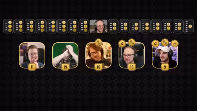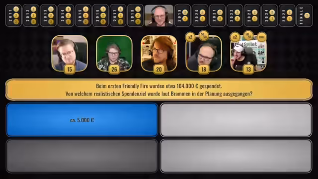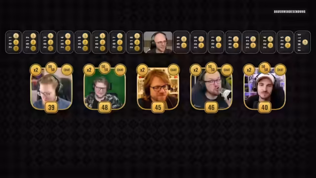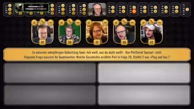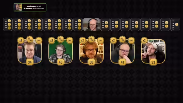 02:16:08Nach einer Pause startet die offizielle Spielshow zum 15-jährigen Jubiläum. Moderator Andreas stellt das Format vor: Ein Quiz durch die 15 Jahre von 2011 bis heute, mit drei Fragen pro Jahr (bzw. zwei ab 2019). Die Teilnehmer spielen einzeln, um Punkte zu sammeln. Der Hauptanreiz ist der Siegerpreis: die Bestimmung von 'Pete Speed' und die Ernennung zum 'neuen Geschäftsführer', während der Verlierer den Kanal verlassen muss.