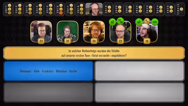 04:14:14Nach mehreren Fragen liegt Tram in Führung, gefolgt von Christian, Sepp und Peter in sehr engem Abstand. Die Teilnehmer diskutieren die Strategie für die verbleibenden Fragen. Es wird empfohlen, den Zweifach-Joker bei überschaubaren Fragen einzusetzen, während bei komplexeren Themen auf den 50-50-Joker gesetzt werden sollte.