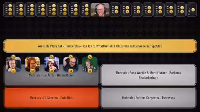 04:19:53Bei einer Frage geht es um die Spotify-Play-Anzahl verschiedener Songs, darunter Himmelblau von den Ärzte und ein Song von Jay. Es stellt sich heraus, dass Sabrina Carpenters Lied ‚Espresso‘ mit 2,7 Milliarden Plays weit vorne liegt. Jay freut sich darüber, bekannter als Ed Sheeran zu sein.