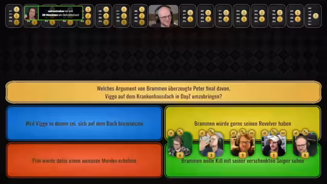 02:30:21Die Quizrunde geht weiter mit einer Frage über eine kontroverse Geschichte aus dem Spiel DayZ. Bram wird der vorgeworfen, Peter dazu überredet zu haben, einen Charakter namens Vigo zu töten. Dies führt zu einer hitzigen Debatte über die moralische und rechtliche Bewertung der Situation, wobei Bram als Anstifter gilt. Der Streamer zeigt einen Clip der damaligen Szene und erinnert sich an die starken Emotionen, die damals bei den Spielern ausgelöst wurden. Die Teilnehmer debattieren über Schuld und Verantwortung in virtuellen Welten.