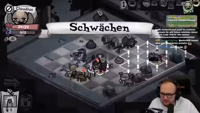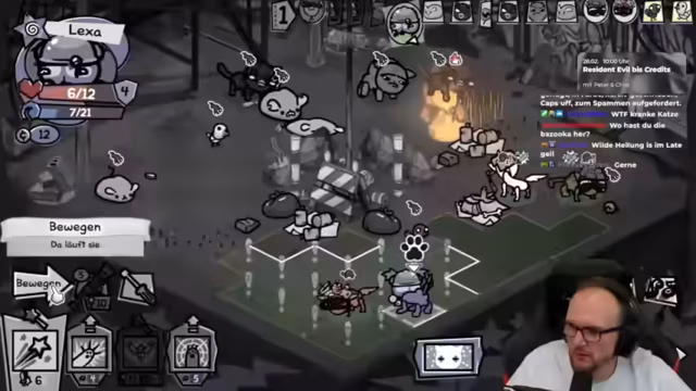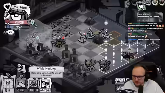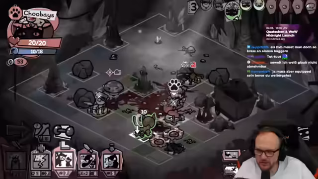 02:30:22Der Stream setzt die Mewgenics-Runde fort, bei der der Spieler mit unvorhergesehenen Problemen konfrontiert wird. Eine Katze erhält 'Katzen-AIDS', was den Grundangriff verursacht, Gift zu verbreiten und den Tank zu schwächen. Dies führt zu erheblichen Komplikationen im Kampfverlauf, da der Tank immer weniger Lebenspunkte hat und der Run gefährdet wird. Trotzdem werden Gegner durch strategische Angriffe und Nutzung von Fähigkeiten wie 'Bazooka' und 'wilde Heilung' besiegt. Die Runde ist intensiv und erfordert ständige Anpassungen, um den Verlust wichtiger Einheiten zu verhindern.