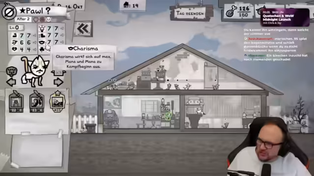 01:25:56Ein zentrales, herausforderndes Element im Spiel ist die ADHS-Fähigkeit bei einer seiner Katzen. Diese Fähigkeit zwingt den Spieler, innerhalb von fünf Sekunden eine Aktion zu wählen, da die Katze sonst eigenständig handelt. Dies erfordert schnelle Entscheidungen unter Druck. Um dieses Problem zu managen, entscheidet sich der Streamer für eine klare Kampfklassen-Strategie. Er bildet ein Team aus drei Nahkämpfern und einem Fernkämpfer, wobei er spezifische Rollen wie Kleriker und Tank zur Heilung und zum Schutz seiner Einheiten priorisiert.