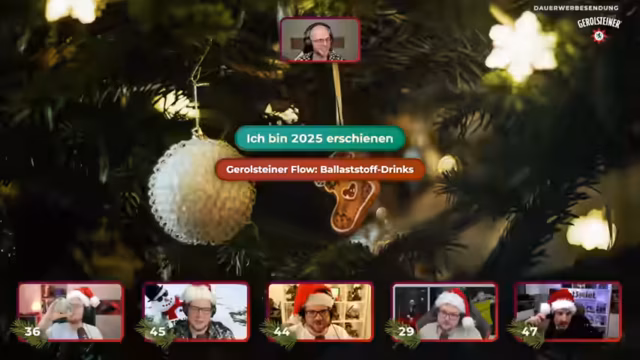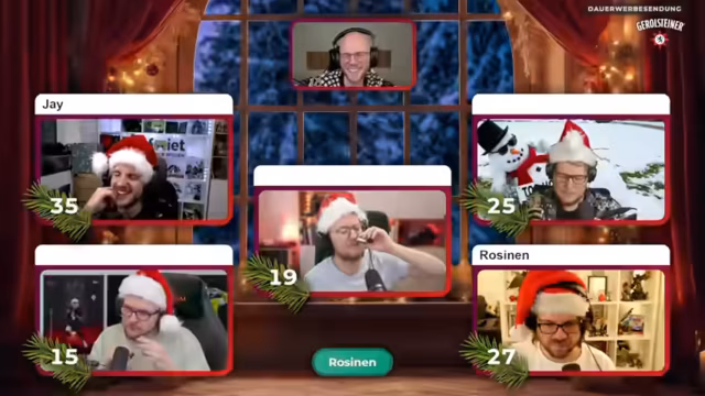 02:17:32Beim Weihnachtslieder-Ratespiel müssen die Teilnehmer verzerrte Soundausschnitte erkennen. Es gibt hitzige Diskussionen über Interpretationen wie 'Stille Nacht' oder 'Leise rieselt der Schnee'. Die Punkteverteilung zeigt Sepp mit 23 Punkten in Führung. Die teils absichtlich schlechten Gesangseinlagen führen zu humorvollen Kommentaren und Ohrwurm-Problemen bei den Streamern. Gegen Ende werden vermehrt klassische Weihnachtslieder wie 'Alle Jahre wieder' genannt.