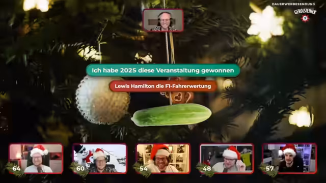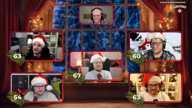 01:02:54Die Moderation kündigt den Beginn einer großen weihnachtlichen Spielshow an. Details zum Ablauf werden noch nicht verraten, aber es gibt Hinweise auf eine interne Wichtelaktion unter den Teilnehmern. Zusätzlich wurden vorbereitete Pakete mit Requisiten verschickt, allerdings gab es bei einigen Personen Lieferprobleme, die kurzfristig geklärt werden müssen.