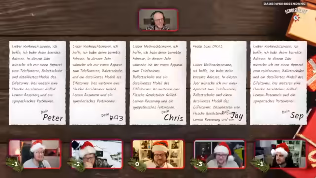 01:28:48Die Runde startet mit einem Diktatspiel, bei dem die Teilnehmer einen Brief an den Weihnachtsmann schreiben müssen. Christian erklärt die Regeln: Jeder Schreibfehler führt zu einem Minuspunkt. Der Text enthält knifflige Passagen wie 'detAilliertes Modell des Eiffelturms' und 'Gerolsteiner Grilled Lemon Rosemary'. Während des Schreibens gibt es technische Probleme mit der Bearbeitungsoberfläche, die zu Verwirrung führen. Am Ende werden die Ergebnisse ausgewertet, wobei Christian mit -1 in Führung liegt.