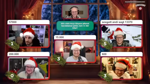01:52:56Ein Quiz rund um Weihnachtsthemen startet mit Fragen zu 'Kevin allein zu Haus' und historischen Fakten. Punkte werden für richtige Antworten vergeben. Die Teilnehmer raten z.B., wo die McAllister-Familie Weihnachten verbringen wollte (Paris) oder wie viele Brüder Kevin hat (zwei). Eine Schätzfrage zu jährlich gepflanzten Bäumen durch Gerolsteiner (40.000) bringt Sepp mit 57.000 die meisten Punkte. Zwischenfragen zur Entstehung des Weihnachtsfestes im 4. Jahrhundert sorgen für Aha-Momente.