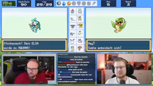 03:36:55Der Streamer und Peter diskutieren die finale Teamzusammensetzung. Der Streamer entscheidet sich für Aquana, das er 'Emma' nennt, während Peter Blitzer nimmt und es 'Elsa' tauft. Es wird auch über die Entwicklung von PflanzenPokemon gesprochen, wie Duflor zu Giflor, und welche Attacken sie erlernen können.