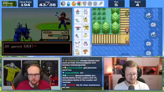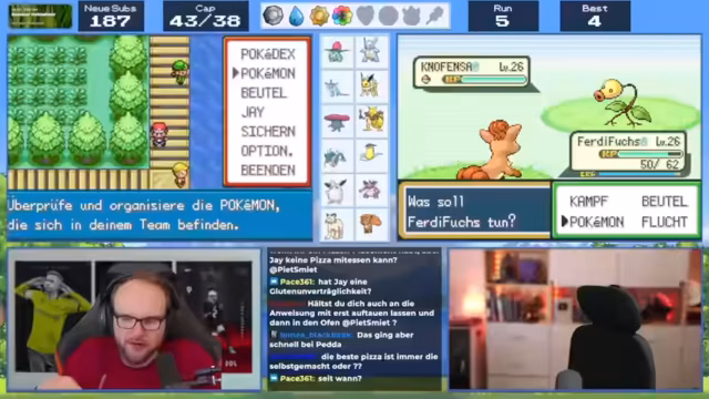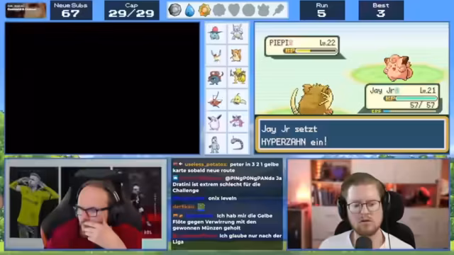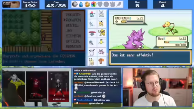 01:44:01Der Streamer erleidet einen Rückschlag, als eines seiner Pokémon, Jay Junior, in einem Kampf besiegt wird. Er ist frustriert, da er die Team-Konstellation als ungerecht empfindet und überlegt, sein Team neu zu strukturieren. Insbesondere sucht er nach einem Feuer-Pokémon, um seine Schwächen auszugleichen. Es entstehen Diskussionen mit dem Chat über die effektivste Strategie und ob ein Feuer-Pokémon wirklich notwendig ist. Auch die Möglichkeit, Evoli zu entwickeln, wird diskutiert.