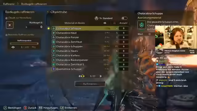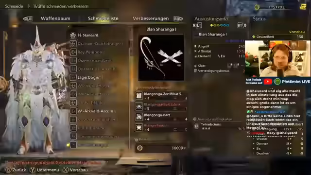 09:18:53Der Fokus verlagert sich auf die Verbesserung der Ausrüstung. Der Jäger baut das Ayarakan-Rüstungsset komplett und schmiedet einen neuen Bogen. Er entscheidet sich für einen Gift-Bogen mit hoher Kritische Treffer-Wahrscheinlichkeit. Die Verstärkung der Waffe erfordert diverse Materialien, die über die Raffinerie aufbereitet werden. Dabei werden auch Rüstkugeln getauscht. Am Ende des Streams plant der Jäger, die Jagd auf einen Wächter Doshaguma fortzusetzen und den Stream nach knapp 10 Stunden zu beenden.