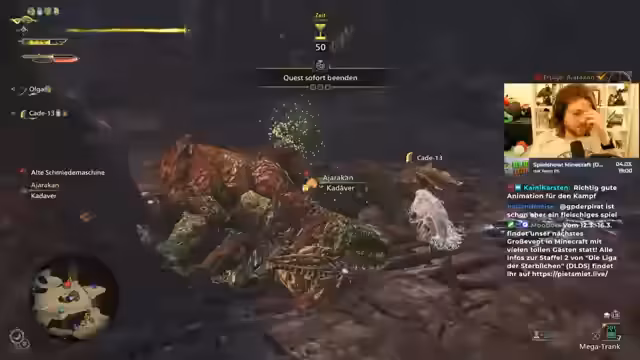 04:12:29Der Streamer beginnt einen Doppelkampf gegen zwei Anjanas, was für erhebliche technische Herausforderungen sorgt. Viele Treffer werden nicht registriert und die Hitboxen werden als ungenau empfunden. Während des Kampfes gibt es auch einen kurzen Ausfall von OBS. Nach dem Kampf werden Fragen zur Mechanik des Spiels gestellt, wie zum Beispiel der Cooldown des Mountens und das Verhalten der Monster bei bestimmten Zuständen. Auch das Inventar und der Status der Mäntel werden thematisiert, was auf ein anhaltendes Unbehagen mit dem UI hindeutet.