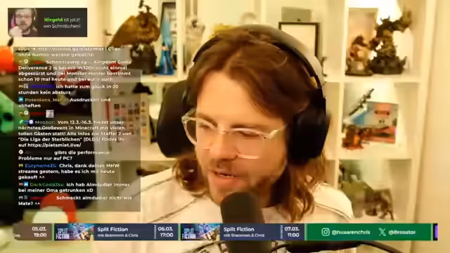 00:07:48Zwischen den Spielvorbereitungen sprechen die Streamer über aktuelle Fußballereignisse der Bundesliga. So wird das Spiel des VfB Stuttgart gegen Bayern München thematisiert, ebenso die anstehenden Partien von Borussia Dortmund und die Situation im Tabellenkeller. Chris bewertet die Spiele als gefährlich, besonders wenn Dortmund gegen vermeintlich schwächere Teams antritt. Danach wird die technische Einrichtung für den Koop-Stream fortgesetzt, um die Chat-Fenster zu verbinden. Gleichzeitig wird die lang gespielte Story von gestern im Spiel mit ca. 15 Spielzeit erwähnt und eine Kaufempfehlung für Monster Hunter ausgesprochen.