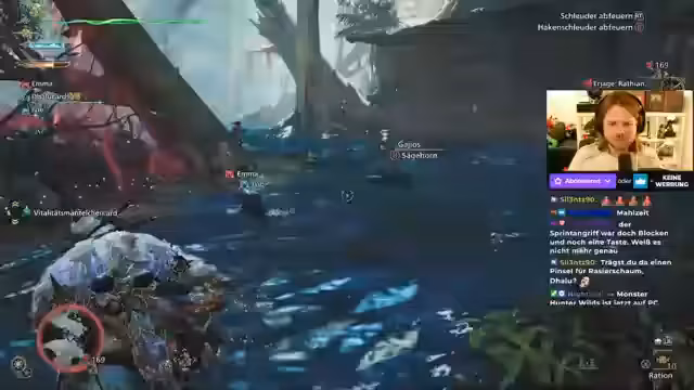 08:40:29Der Stream beginnt mit der gezielten Jagd nach Monsterknochen. Es wird versucht, Wegpunkte auf Knochenhaufen zu setzen, was jedoch an Spielmechaniken scheitert. Der Jäger navigiert durch das Gebiet, sammelt Knochen, darunter auch seltene Relikte wie Drachenknochen. Nach der erfolgreichen Sammlung wird das Basislager aufgesucht, um die Beute zu deponieren und optional eine Quest zu starten. Parallel dazu spricht der Streamer über seinen Hunger auf Currywurst, was zu einer lockeren Unterhaltung im Chat führt.