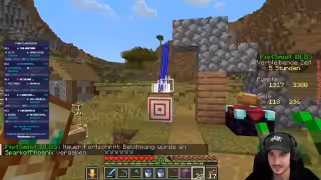 04:33:02Nach dem erfolgreichen Fall werden fast 1600 Punkte erreicht. Nun soll die Maze-Challenge vorbereitet werden. Das Wasser unterhalb des Turms wird zubaut, um das Abheben zu erleichtern. Ein Pferd wird als Zielobjekt ausgewählt, und es wird versucht, es an einem Zaun zu befestigen, was sich als schwierig erweist. Es wird überlegt, den Zaun niedriger zu setzen oder einen anderen Zaun zu verwenden. Resourcen werden knapp. Der Chat schlägt vor, die Maze-Challenge von einer Höhe von 130 Blöcken zu starten, um Raketen zu sparen. Eine Plattform wird in der Nähe dieser Höhe gebaut. Es wird besprochen, dass nach dem Anbringen des Pferdes die Maze genutzt wird, um es zu treffen. Es wird festgestellt, dass viele Mobs in der Nähe sind. Während einer Pause soll mit dem Brauen von Tränken begonnen werden. Ein Testobjekt wird aufgehängt und ein Wasserfall wird gebaut.