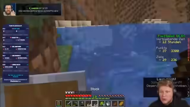 03:05:59Der Stream beginnt mit der Erkundung des Uferbereichs und dem Versuch, Boote zu nutzen, um die Höhle sicher zu erreichen. Es werden Bedenken geäußert, fallschädigende Höhen beim Bootfahren könnten. Die Suche nach Ressourcen wie Zuckerrohr, Schilf und Bienenstöcke wird fortgesetzt, wobei mehrere Gegenstände wie ein Schwarm aus Bienen, der nur mit Silk Touch abgebaut werden kann, entdeckt werden. Auch die Herstellung von Tränken und die Implementierung von neuen Achievements wie das Löschen von Lava mit Wasser werden thematisiert.