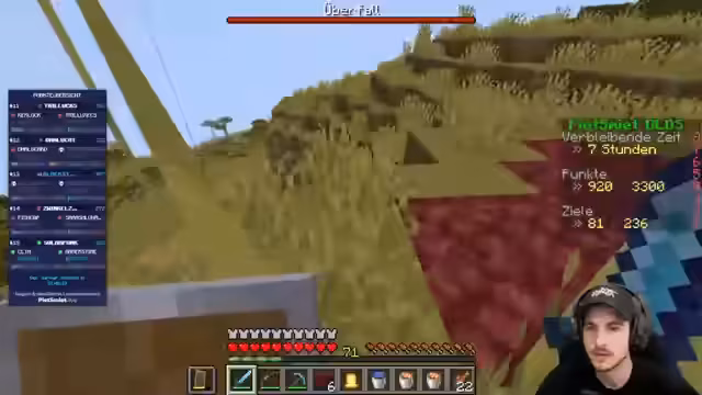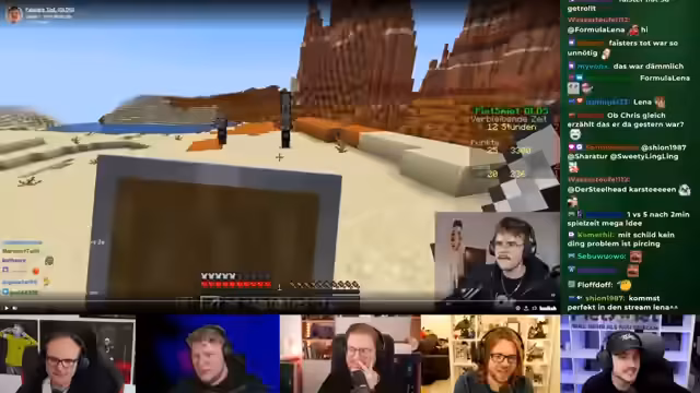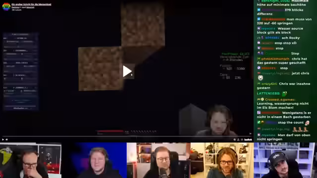 00:56:17Zu Beginn des Streams treten technische Unannehmlichkeiten auf, als ein Streamer kurz aus dem Boot aussteigt und prompt stirbt. Später wird ein seltsamer Minecraft-Bug diskutiert, bei dem von einem Mob platzierter Blockinhalt sofort wieder verschwindet. Die Streamer klären, dass es sich hierbei nicht um einen Bug, sondern um ein bekanntes Phänomen bei Multiplayern-Servern handelt, bei dem ein Fall nicht durch einen Fehler des Spielers als Tod gewertet werden darf.