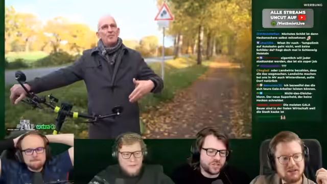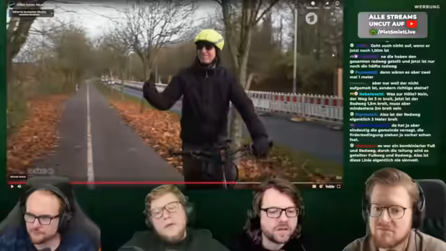 03:00:25Der Streamer startet offiziell den Segment 'Realer Irrsinn' und begrüßt die Teilnehmer Bram, Christian und Jay. Als erstes Thema wird eine kuriose Nachricht aus Schleswig-Holstein besprochen: Ein neu gebauter Radweg ist zu schmal, weil eine weiße Linie rechtlich nur als Trennung und nicht als Teil des Radwegs anerkannt wird. Dies gefährdet die Fördergelder von 1,5 Millionen Euro und führt zu einer Diskussion über Bürokratie.