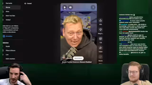 01:52:44Der Streamer klärt auf, wie die finanziellen Beteiligungen bei der Firma von Knossi funktionierten. Seiner Investition von 20.000 Euro folgte ein Investor, der 200.000 Euro einbrachte. Durch diese Erhöhung des Stammkapitals wurde sein Anteil prozentual reduziert, ohne dass er direkt Geld erhielt. Er erkennt an, dass es möglich ist, dass Knossi für seine Anteile Geld bekommen hat, wenn diese an andere Investoren verkauft wurden, betont aber, dass das eine andere Frage sei.