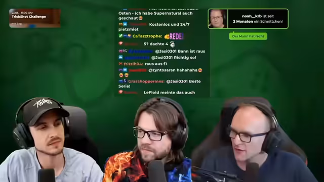 01:02:55Ein Zuschauer fragt nach persönlichen Verhaltensweisen, die die Streamer an Menschen stören. Während verschiedene Dinge wie lautes Essen am Mikrofon genannt werden, führen Unfreundlichkeit und ignorantes Verhalten im Gespräch als Haupttrigger. Auf eine Frage nach Veränderungenswünschen für die Community wird betont, dass man eine sehr offene und dankbare Community habe. Man wünschte sich jedoch mehr Akzeptanz, wenn nicht das Hauptteam streamt, und eine allgemein positivere Kommunikation im Internet. Mods halten den Chat bereits seit Jahren sehr sauber.