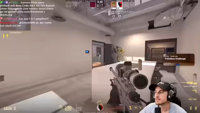 01:49:20Der Stream beginnt mit einem hoch intensiven CS2-Spiel auf der Map 'Agency'. Der Streamer befindet sich in einem heftigen Feuergefecht, in dem er sowohl Gegner als auch Teamkollegen mit taktischen Rauchgranaten ('Smoke') attackiert und verteidigt. Er navigiert durch verwinkelte Gänge und Treppenhäuser, wobei er seine Position kontinuierlich anpasst, um gegnerische Angriffe abzuwehren und selbst zu pushen. Das Gameplay ist geprägt von kurzen, präzisen Entscheidungen und schnellen Zielwechseln, wobei er mehrmals knapp dem Tod entgeht und Gegner mit konzentrierten Schüssen eliminiert.