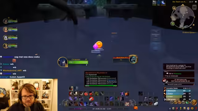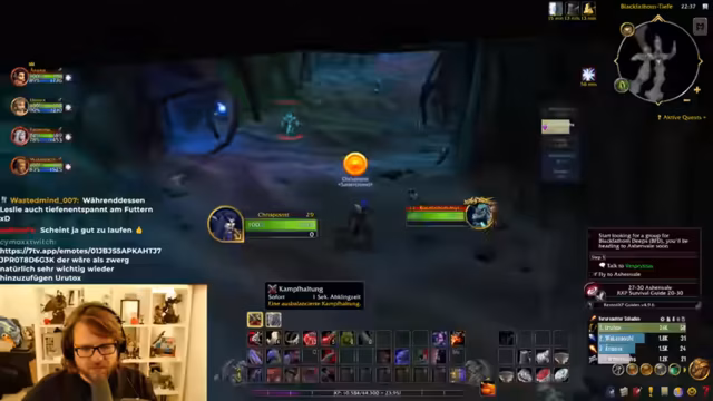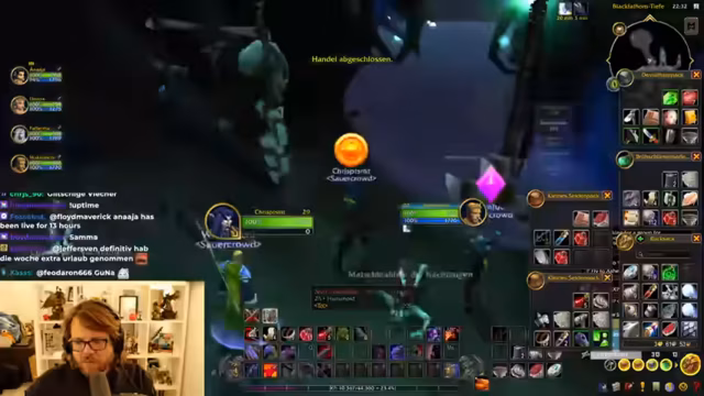 Die Gruppe absolviert die Instanz 'Black Fathom Deeps' mit Erfolg. Nach intensivem Farmen wird der benötigte Quest-Gegenstand gefunden, was große Freude auslöst. Neben der Quest werden auch wertvolle Ressourcen wie schillernde Perlen gesammelt. Die Zusammenarbeit wird als vorbildlich beschrieben. Nach Abschluss des Dungeons wird auf das weitere Vorgehen geschaut und der Streamer kündigt bereits Inhalte für den Folgetag an.