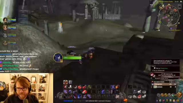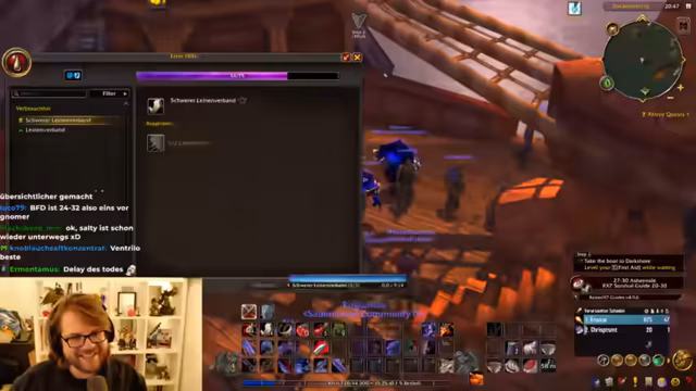 01:51:51Der Streamer befindet sich auf dem Weg zur Instanz 'Black Fathom Deeps', indem er zunächst nach Menethil Harbour fliegt und mit dem Boot weiterreist. Während der Reise werden verschiedene Quests abgegeben und neue angenommen. Es kommt zu einer Verwirrung bezüglich der Quest 'Wissen in der Tiefe', die entweder aus Ironforge oder Darnassus stammen kann, was die Koordination im Team erschwert. Der Streamer nutzt sein Magier-Talent, um sich schnell zu teleportieren und fehlende Quests abzuholen.