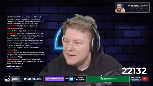 00:19:17Es wird ein Pete-Wein erwähnt und ein Eiswein, dessen Flasche 60 Euro kostet. Es wird auf eine Verzögerung bei der Veröffentlichung eines Videos auf Pete's Meet Live hingewiesen, die auf technische Probleme zurückzuführen ist. Das Video soll jedoch noch am selben Abend veröffentlicht werden. Vorher wird Kingdom Come Deliverance gezeigt. Es wird ein Thumbnail für Civilization 7 benötigt. Es wird die Partnerschaft mit 2K erwähnt. Es wird nach Foundation Steam gefragt, ein Spiel, das der Streamer bereits gespielt hat. Ein Zuschauer schlägt ein Reaction-Video zu einem YouTube-Video von Gronkh vor, was direkt weitergegeben wird. Es wird ein Bug bei Twitch erwähnt, der dazu führt, dass Subs nicht in der Sub-Liste angezeigt werden, wenn sich Leute selber einen Sub kaufen und nicht giften. Es wird auf die Möglichkeit eingegangen, dass die Anzeige der Subs falsch ist.