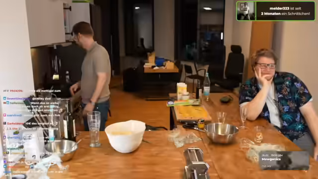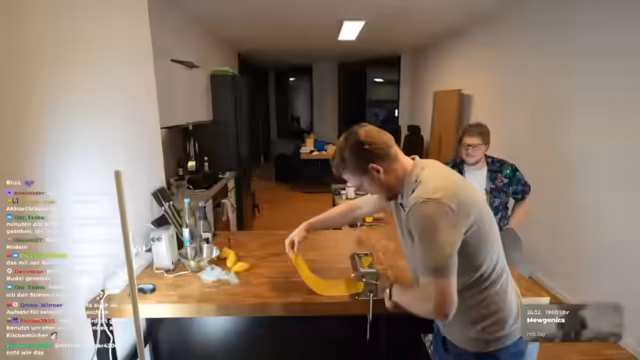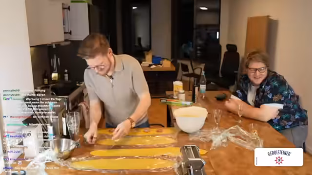 02:56:58Nachdem die Vorbereitungen für die Vorspeise abgeschlossen sind, konzentriert sich der Streamer auf die Herstellung der Ravioli. Der Teig wird in vier Stücke geteilt und mit der Nudelmaschine zunächst auf Stufe 6 zu langen Bahnen verarbeitet. Währenddessen sucht er nach einer geeigneten Abdeckung für den Teig, damit er nicht austrocknet, und entscheidet sich für Backpapier. Die Ausrollung der Teigbahnen gestaltet sich aufgrund der begrenzten Platzverhältnisse und fehlender optimaler Ausrüstung etwas holprig, aber der Prozess wird vorangetrieben.