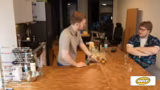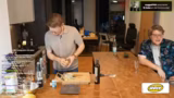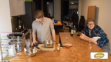 00:50:50Zu Beginn dieses Abschnitts bereitet Bram die Zutaten für das 3-Gänge-Menü vor. Wichtig ist, dass die Teigbälle unterschiedlich gelagert werden: einer muss außerhalb des Kühlschranks ruhen, der andere Dessert-Teig muss im Kühlschrank bleiben, um sie später unterscheiden zu können. Gleichzeitig wird erwähnt, dass der bereits zubereitete Teig für die Nudeln ruht und Eier getrennt wurden. Die Arbeitsfläche wird mit einem feuchten Lappen gereinigt, und Bram entdeckt das Feature des ziehbaren Wasserhahns, welches er selbst noch nie genutzt hatte, seine Frau aber entdeckt hat. Bram beginnt anschließend mit der Vorbereitung der Füllung für die Tortellini, indem er Zutaten wie Petersilie und Koriander sehr fein schneidet.