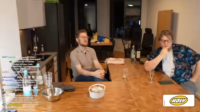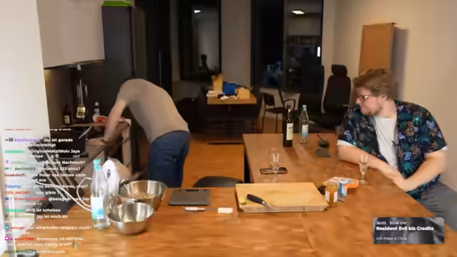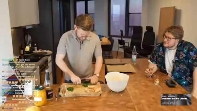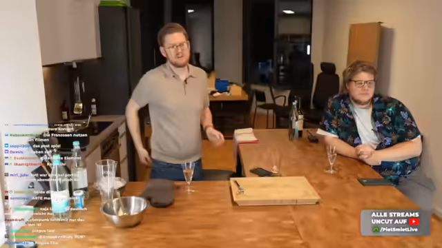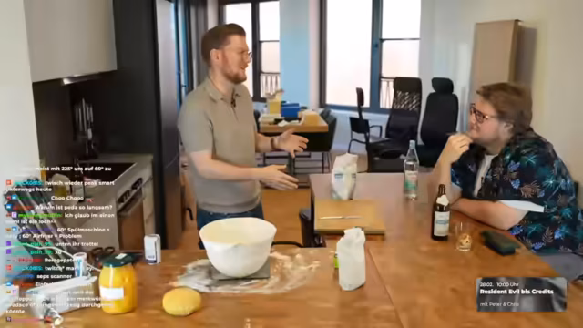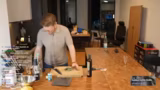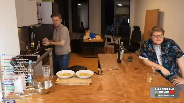 00:00:59Der Stream beginnt mit technischen Problemen, die jedoch schnell gelöst werden. Bram kündigt an, für Dennis ein Drei-Gänge-Menü zuzubereiten. Er hat sich eine anspruchsvolle Aufgabe gestellt, da zwei der drei Gänge auf Teigbasis beruhen. Bram ist bereit, Dennis bei Zubereitungsschritten wie dem Schneiden von Zwiebeln zu helfen, sieht seine Stärke aber eher bei der Vorbereitung der Beilagen. Die beiden unterhalten sich über Getränke, wobei Bram verschiedene Weine mitgebracht hat, die zunächst gekühlt werden müssen.