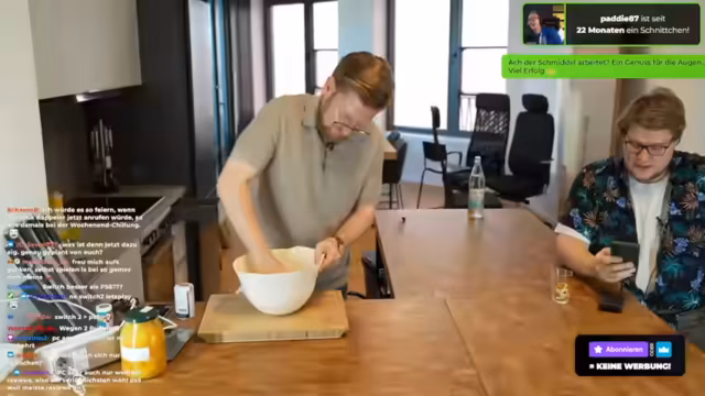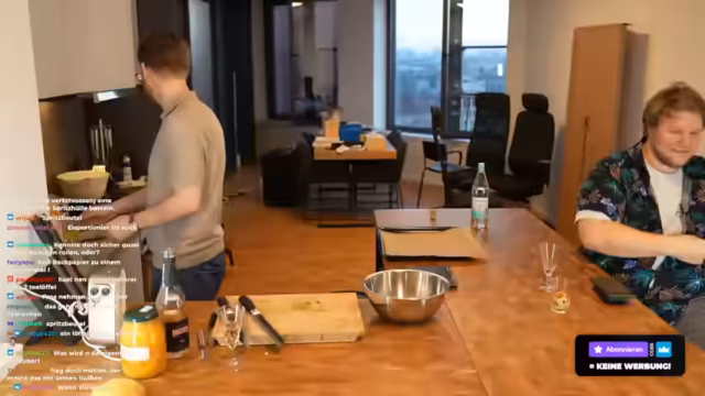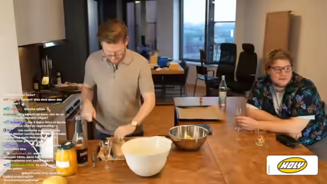 04:54:42Die Zubereitung des Desserts, einem Mandel-Baiser, steht im Fokus. Bram beschreibt die Schritte: Eiweiß wird steif geschlagen, Zucker und gemahlene Mandeln untergehoben. Parallel dazu werden zahlreiche private und alltägliche Themen angesprochen. Dazu gehören Brams Wohnung, die Rückfahrt mit Uber, die Nennung eines Freundes mit einem Klodeckel-Geburtstagsgeschenk und die Überlegung, ob Möbel abgenutzt aussehen müssen, um als 'benutzt' zu gelten.