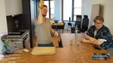 00:31:49Nachdem der Nudelteig ruht, widmet sich Bram dem Teig für das Dessert. Er benötigt für den süßen Mürbeteig nur ein Ei, Mehl, Zucker und Butter. Während er die weiche Butter vorbereitet, erhalten die Streamer neue Informationen über die geplante College-Jacke. Benjamin hat nach einem Jahr Entwicklungszeit den finalen Preis festgelegt, der zwischen 200 und 300 Euro liegen wird. Bram erklärt, dass trotz des hohen Preises die Auflage sehr gering sein wird und sie mit dem Ergebnis sehr zufrieden sind. Bram knetet schließlich den Mürbeteig und stellt fest, dass er möglicherweise noch etwas Feuchtigkeit benötigt.