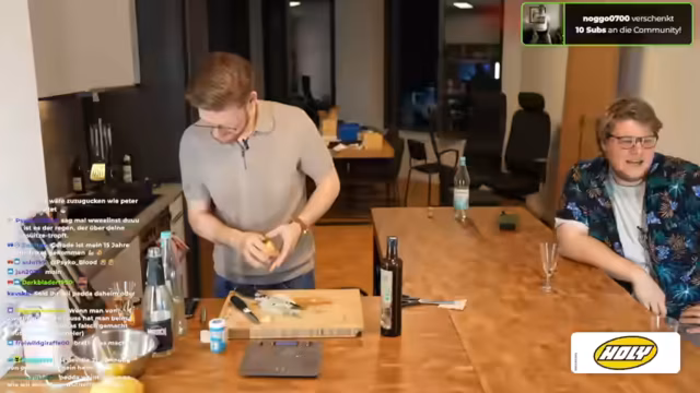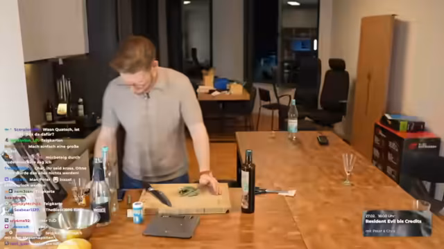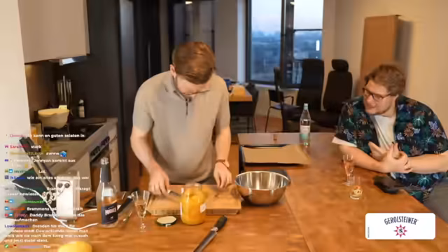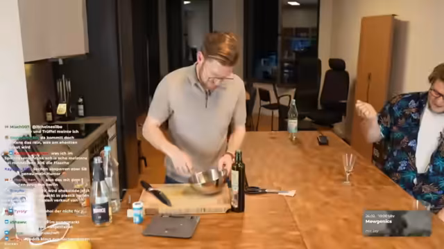 02:40:03Während des Kochprozesses probiert der Streamer gemeinsam mit Bram Wermut. Er erklärt, dass es verschiedene Sorten gibt und probiert einen roten italienischen Wermut, der ihm schmeckt. Parallel wird die Vorspeise, eine Sauce mit Wermut, Zwiebeln und Limette, zubereitet. Bei der Gewichtung der Zutaten kommt es zu kleinen Missverständnissen und Diskussionen im Chat über die korrekte Menge, wobei der Streamer betont, dass Zwiebeln als Geschmacksgeber eine wichtige Rolle spielen und die genaue Menge nicht immer kritisch ist.