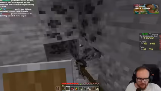 06:37:58Der Streamer überlegt, in eine Höhle zu gehen, um Diamanten zu finden, da dies für bestimmte Aufgaben notwendig ist und er genügend Essen besitzt. Er fragt den Chat nach Tipps für unterirdische Aufgaben, wie das Abbauen von Smaragd-Erz oder das Erreichen des Bedrocks. Trotz der Dunkelheit und der Präsenz von Creepern versucht er, zu überleben und Aufgaben wie das Treffenlassen von zwei Bienen zu erfüllen, was ihm eine Honigflasche und Punkte einbringt. Das Finden eines Dorfes erweist sich jedoch als schwierig, und er läuft immer wieder an die Grenze der Welt, was die Suche erschwert. Ein Nether-Portal wird entdeckt, aber das notwendige Eisen zum Abbauen fehlt, was die Frustration über die fehlenden Ressourcen verstärkt.