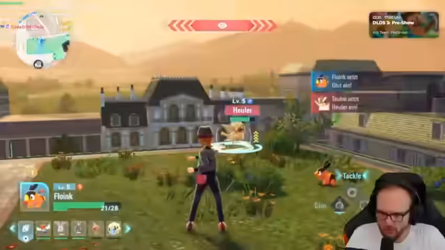00:18:41Nach der Charakteranpassung, bei der der Streamer Haarfarbe und Aussehen wählt, landet der Protagonist Jay in Illumina City. Das erste Gespräch mit der Präsidentin der Quasar Corporation, Jette, dient als exzellente Tutorial-Einführung in die Welt. Der Streamer ist beeindruckt von der scharfen Darstellung der Charaktere, kritisiert jedoch die-detailarme Grafik der Hintergründe. Die Einführung in das Kampfsystem erfolgt direkt im ersten Kampf gegen Pampam und wird als erfrischend und anders im Vergleich zu alten Pokémon-Teilen bewertet.