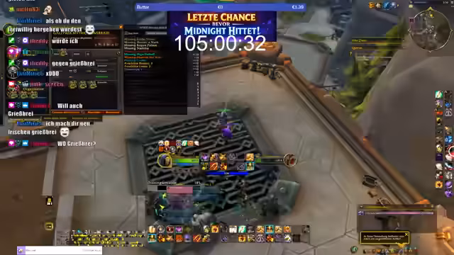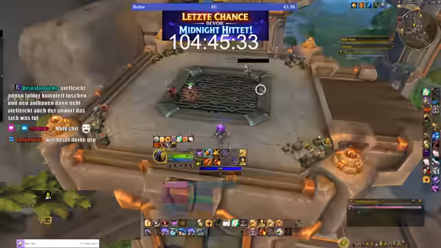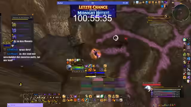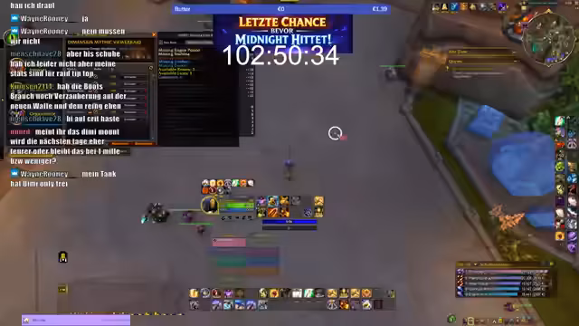 05:37:30Eine zentrale Ankündigung betraf die Zeitlichkeit der Mount-Verfügbarkeit. Der Streamer informierte die Zuschauer dass die Mounts mit 'Midnight' verschwinden und die Drop-Chance von derzeit garantiert auf 0,1 bis 1,5 Prozent sinken werde. Man habe noch '100 Stunden und 52 Minuten' Zeit. Er rief die Community auf mitzumachen: 'wenn ihr partizipieren wollt ausrufezeichen mount da stehen die anforderungen oben'. Es wurde entspannt weitergespielt um die Zeit bis zum Deadline auszunutzen.