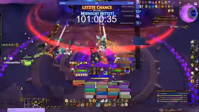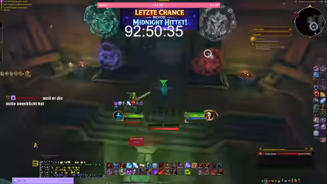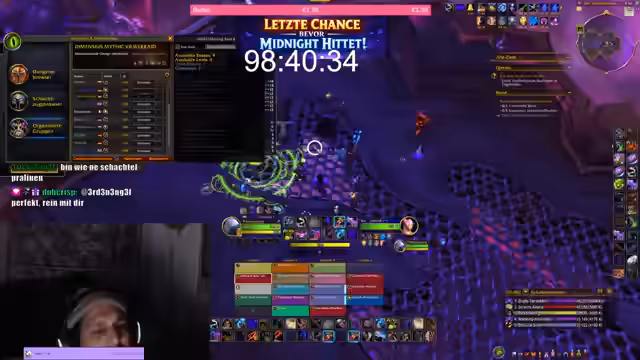04:09:08Ein Raid für den Boss 'Dimensius, der Entfesselte' wird gestartet. Viele Teilnehmer sehen diesen Boss zum ersten Mal auf mythischem Schwierigkeitsgrad. Die Erklärung der Mechanik konzentriert sich auf die Positionierung und die Nutzung von Entwickler-Cooldowns (Dev-CDs). Die Strategie betont, den Boss als Ziel zu haben und ablenkende Adds zu ignorieren, während die Heilung die Gruppe am Leben erhält.