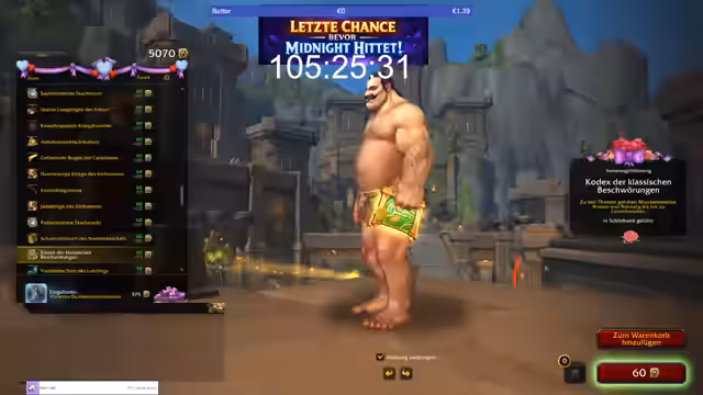 00:12:03Der Streamer begrüßt die Zuschauer und stellt fest, wie schnell die Zeit vergeht. Es läuft ein Countdown von 106 Stunden und 17 Minuten bis zur Veröffentlichung der Midnight Edition. Der Hauptfokus des Streams liegt auf der letzten Chance, Mounts für die Collectors Edition zu erhalten. Der Streamer erwähnt gelegentliche Tätigkeiten wie das Aufräumen von Inventaren und das Verkaufen von Gegenständen, während parallel eine Auktion für die Collector's Edition läuft.